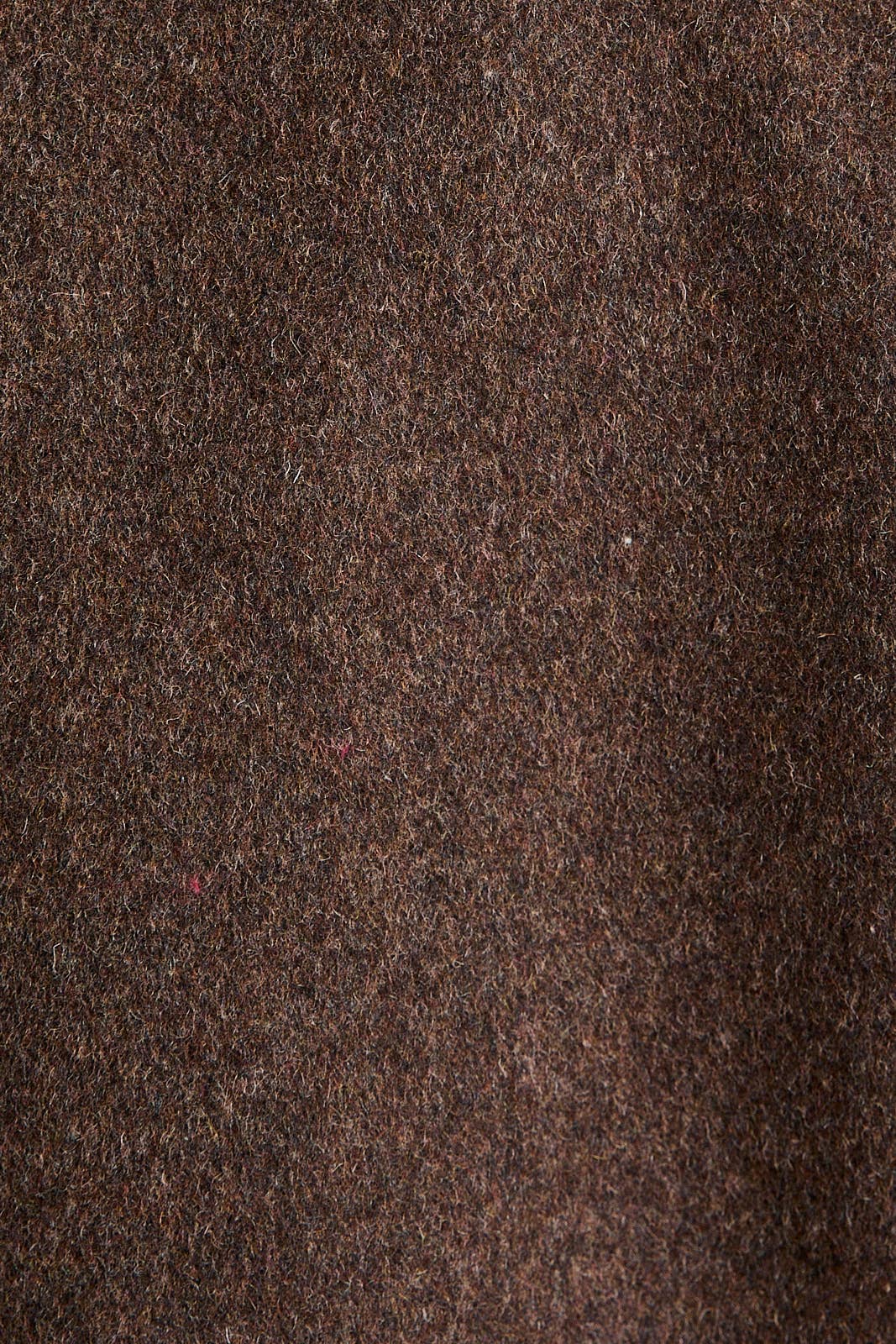 This chocolate-brown tie-front jacket offers a perfect mix of style and comfort. Crafted from a soft, cozy material, it features a structured collar and three bow-tie closures that add a unique, feminine touch. The relaxed silhouette makes it ideal for layering over basics or sweaters, while the rich brown tone pairs effortlessly with any wardrobe. Model is wearing a size XS. The model's height is around 5'1''